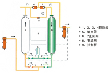 一、流程图 二、产品特点 具有稳定一致的出气压力和露点 吸附塔之高度与直径经实验结果精密计算,塔床阻力小,保证了压缩空气与干燥剂5秒的接触时间,满足成品气的露点要求。